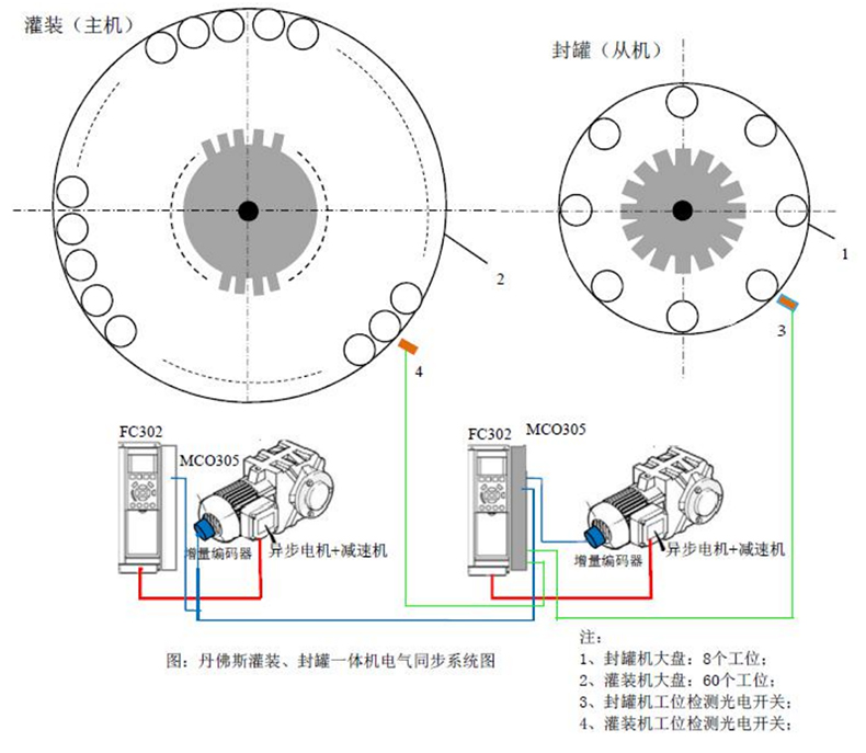 丹佛斯 FC302+MCO305 為灌裝封口組合機提供了易于安裝和調(diào)試的電氣同步解決方案,以下作詳細說明。