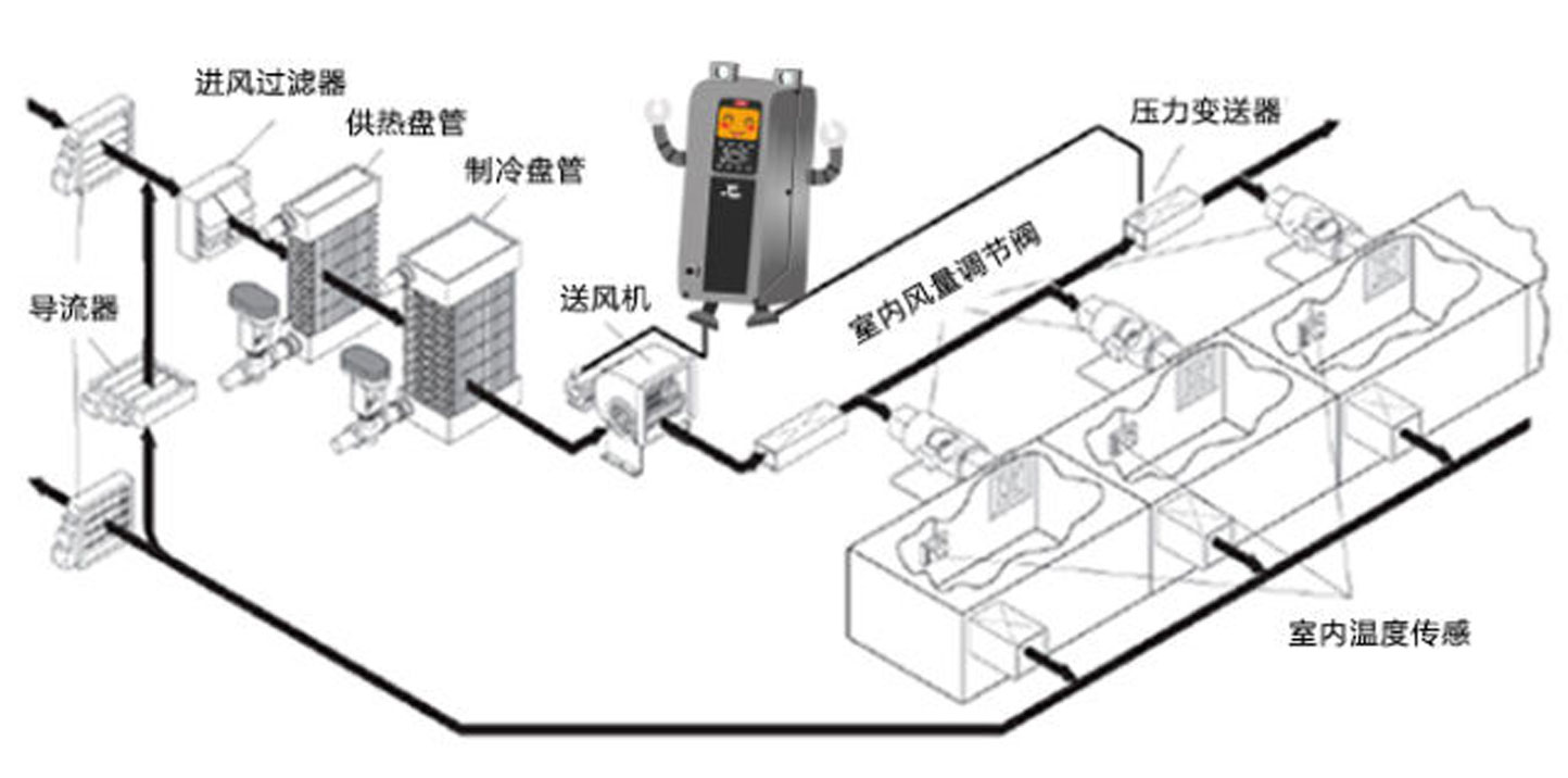 在假定送風主管道溫度恒定的前提下,當室內(nèi)溫度傳感器感測到溫度與控制器設(shè)定溫度不匹配時,控制器將改變室內(nèi)風量控制閥的開度,進而調(diào)整從送風主管道進入室內(nèi)的風量,改變室內(nèi)溫度。