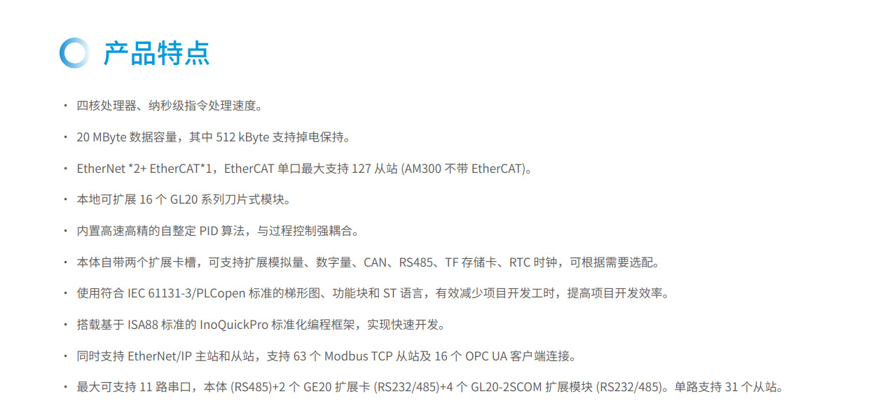 AM300系列是匯川技術(shù)推出的新一代中型PLC,其設(shè)計(jì)開(kāi)發(fā)完全符合PLCopen規(guī)范和IEC-61131-3標(biāo)準(zhǔn),支持ST,LD,SFC,CFC等編程語(yǔ)言,具備高性能、小體積、模塊化等優(yōu)點(diǎn)。集成如EtherNet/IP、OPC UA、Modbus TCP(支持兩路不同網(wǎng)段的IP地址)、TCP/IP、RS485(最大可擴(kuò)展至3路)、CAN總線等全球標(biāo)準(zhǔn)工業(yè)網(wǎng)絡(luò)。主要應(yīng)用于暖通空調(diào)、化工印染、水處理、污水處理、熱處理等過(guò)程控制行業(yè),同時(shí)可作為物流、汽車、日用品等單機(jī)組合產(chǎn)線的網(wǎng)絡(luò)通信站點(diǎn),滿足內(nèi)外網(wǎng)隔離、高速總線通信及數(shù)據(jù)處理的場(chǎng)景應(yīng)用需求。其開(kāi)發(fā)編程平臺(tái)InoProShop覆蓋從多軸復(fù)雜應(yīng)用、離散單機(jī)應(yīng)用到基本邏輯應(yīng)用,可搭載匯川技術(shù)基于ISA88標(biāo)準(zhǔn)開(kāi)發(fā)的InoQuickPro標(biāo)準(zhǔn)化編程模板框架,實(shí)現(xiàn)規(guī)范的標(biāo)準(zhǔn)化管理開(kāi)發(fā),降低人才培訓(xùn)成本。
