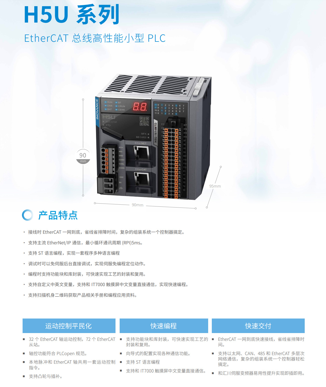 匯川技術(shù)推出首個應(yīng)用EtherCAT 總線的小型PLC H5U,讓線體設(shè)備飛速運轉(zhuǎn)。隨著終端消費日趨升級,生產(chǎn)制造面臨巨大的壓力,而H5U 能夠簡化布線量、加快編程調(diào)試時間、滿足帶軸能力的要求以及嚴苛的成本控制需求,從容應(yīng)對嚴峻的挑戰(zhàn),是將EtherCAT總線應(yīng)用到小型PLC 的先鋒之作。