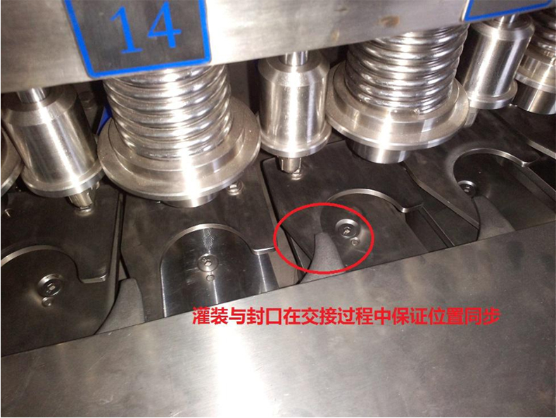 2、在運行過程中始終保持工位一一對應(yīng),實現(xiàn)灌裝機和封口機位置同步,保證灌裝與封口環(huán)節(jié)的平滑交接,不影響罐內(nèi)液體容量偏差和保證罐體外形完好無損
