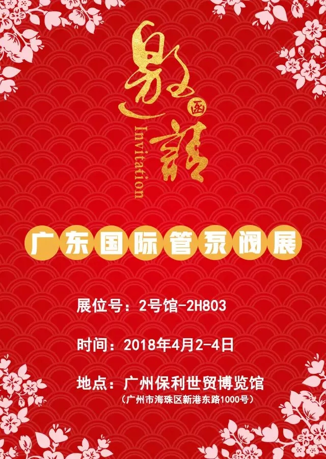 2018廣東國際泵管閥展于4月2-4日在廣州保利世貿博覽館舉辦。50萬大數(shù)據(jù)資源平臺,主辦方大力開發(fā)華南地區(qū)終端市場、外貿及海外經(jīng)銷商,為你帶來華南首屈一指的專業(yè)展會。