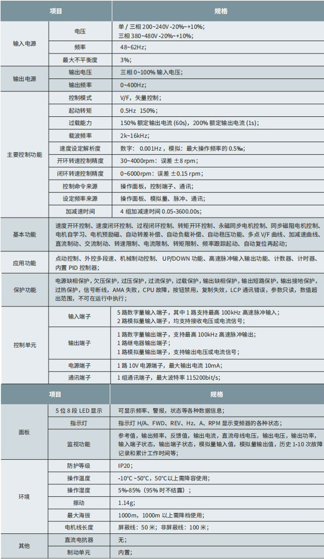 點(diǎn)動(dòng)控制、外控多段速、機(jī)械制動(dòng)控制、UP/DOWN功能、高速脈沖輸入輸出功能、計(jì)數(shù)器、計(jì)時(shí)器、內(nèi)置PID控制器;