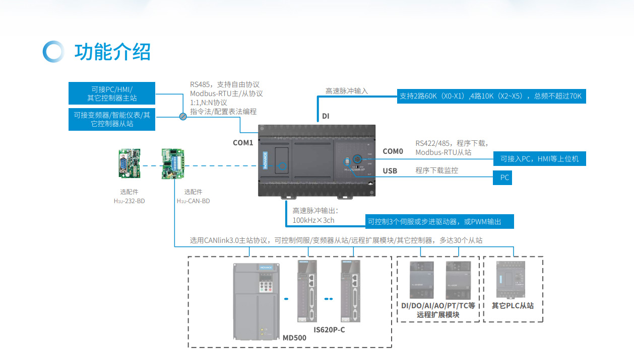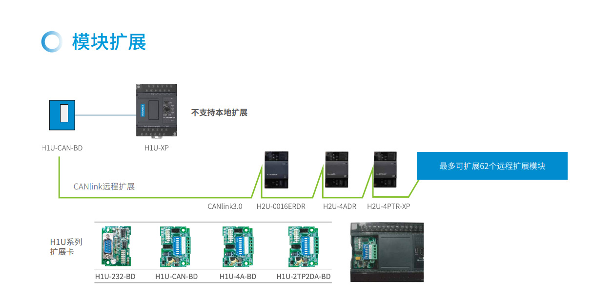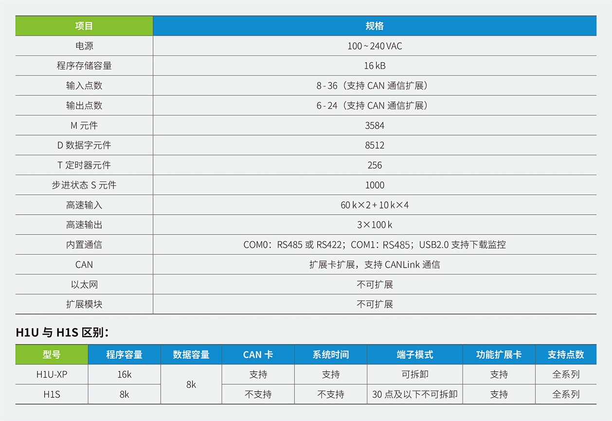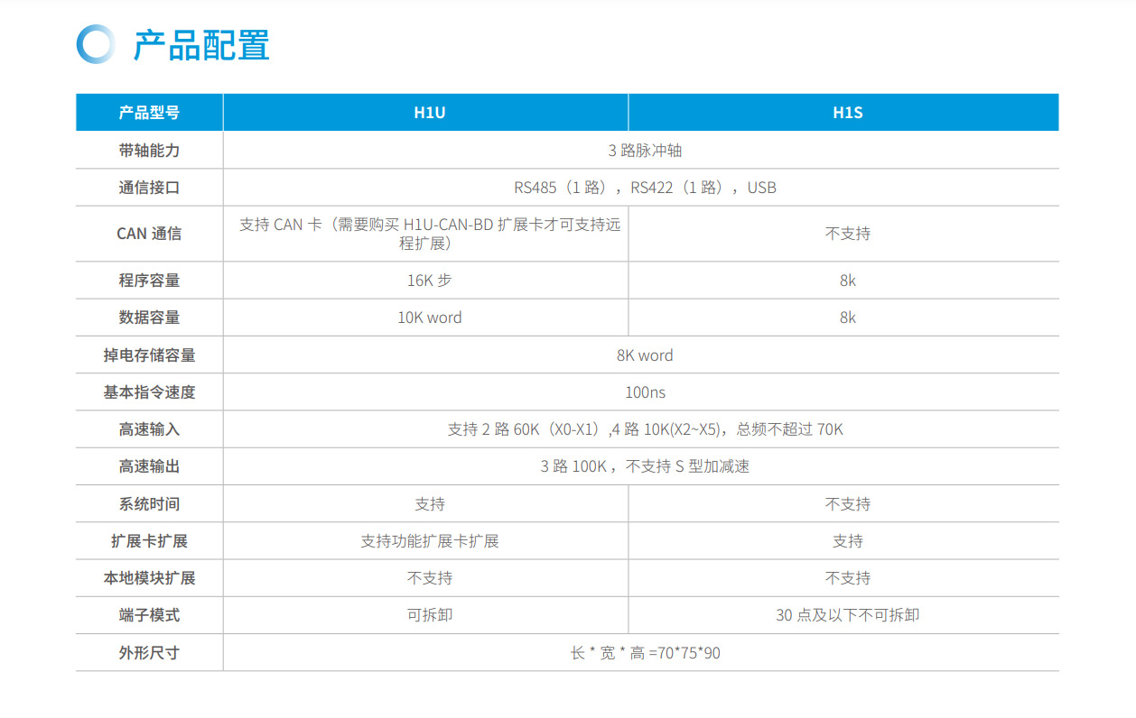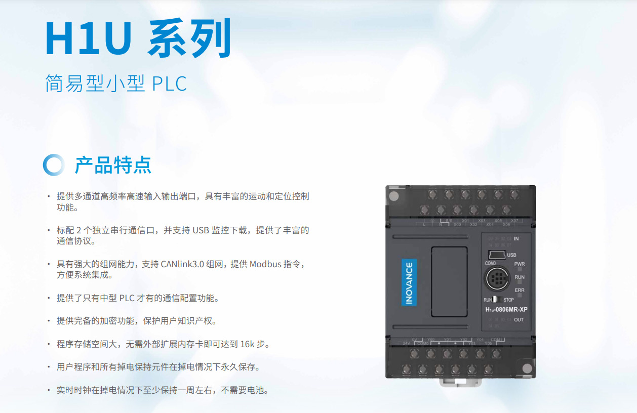 H1U系列PLC 隸屬匯川小型PLC 經(jīng)濟(jì)型系列,其主要特點(diǎn)具備小體積,大程序容量,并具備3 軸高速100K 脈沖以便實(shí)現(xiàn)高精度定位。支持CANlink 擴(kuò)展卡擴(kuò)展H2u 系列的遠(yuǎn)程擴(kuò)展模塊來(lái)豐富IO。該系列PLC 點(diǎn)數(shù)覆蓋14~60 點(diǎn)。是小型自動(dòng)化設(shè)備高性價(jià)比的選擇。