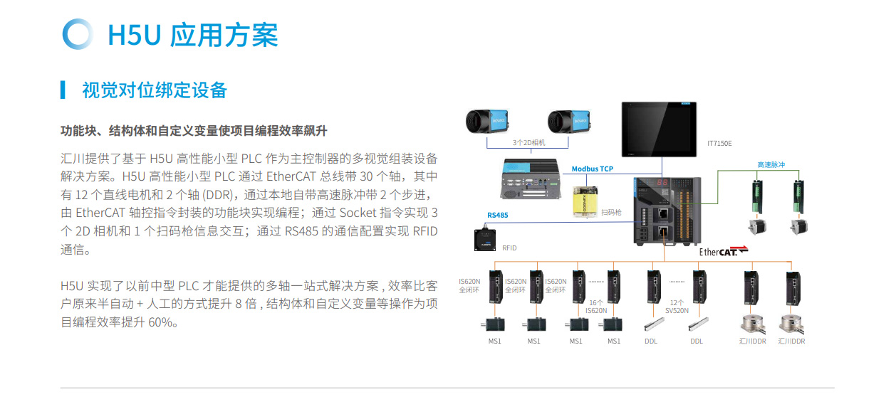 匯川技術(shù)推出首個應(yīng)用EtherCAT 總線的小型PLC H5U,讓線體設(shè)備飛速運轉(zhuǎn)。隨著終端消費日趨升級,生產(chǎn)制造面臨巨大的壓力,而H5U 能夠簡化布線量、加快編程調(diào)試時間、滿足帶軸能力的要求以及嚴苛的成本控制需求,從容應(yīng)對嚴峻的挑戰(zhàn),是將EtherCAT總線應(yīng)用到小型PLC 的先鋒之作。