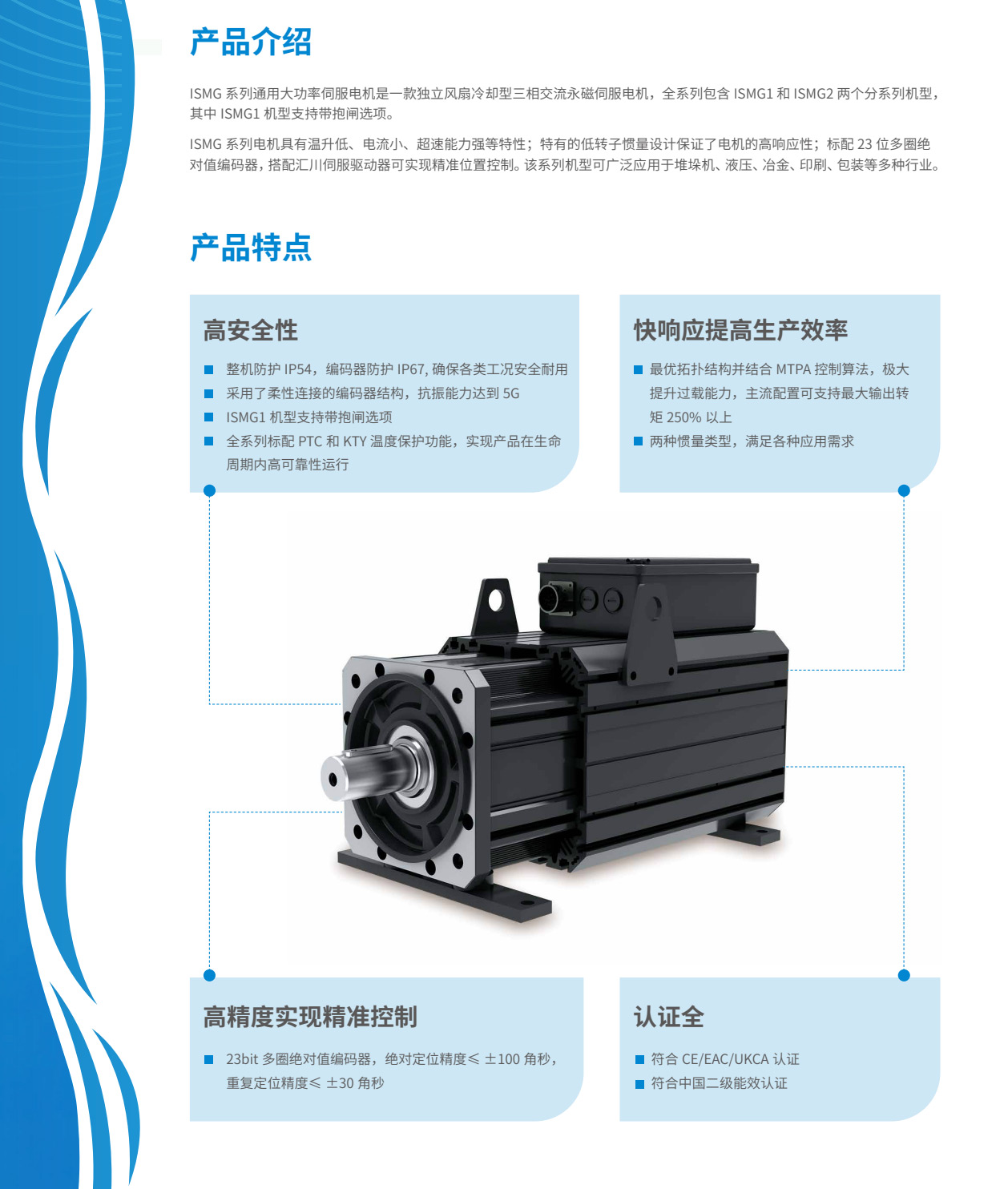 ISMG系列伺服電機產(chǎn)品,功率覆蓋7.5 kW ~ 80 kW、標配23 位絕對值編碼器;產(chǎn)品的IP54 防護等級設計、耐沖擊振動的編碼器結構設計保證了產(chǎn)品可以覆蓋絕大多數(shù)工業(yè)場合的應用;獨特的電磁設計及風冷回路設計、內(nèi)置熱保護器,實現(xiàn)了產(chǎn)品在生命周期內(nèi)高可靠性運行;ISMG1系列亦可加裝150 N·m 制動扭矩的制動器。